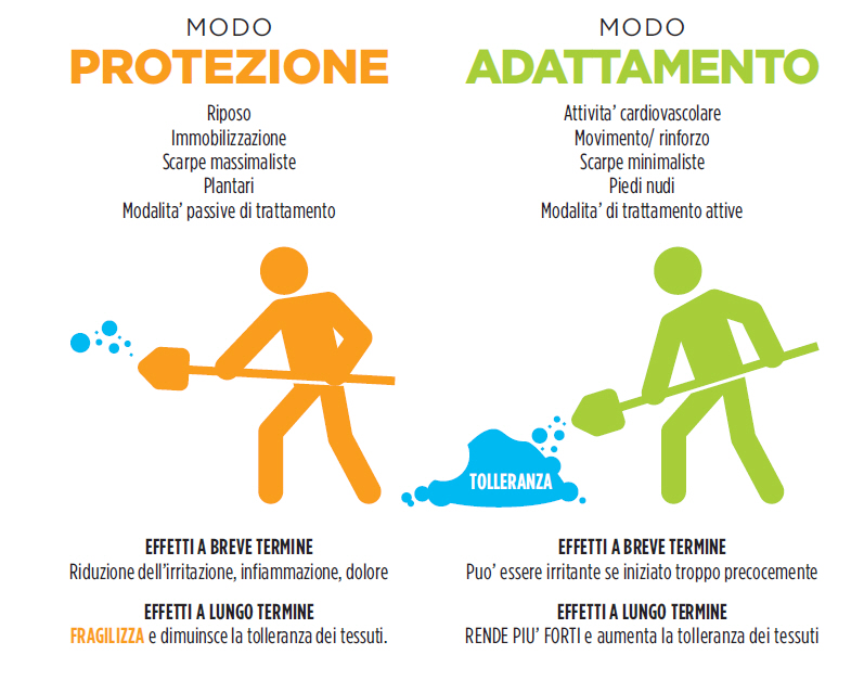 Per molto tempo i professionisti della salute hanno preferito un approccio protettivo rispetto a quello di adattamento. Ancora oggi, troppe patologie vengono trattate esclusivamente con metodi protettivi come il riposo, l’immobilizzazione o la limitazione del movimento per paura del dolore. Queste tecniche di protezione devono essere adottate a breve termine in caso di traumi e dolori acuti, ma diventano rapidamente deleterie e impediscono un recupero ottimale, se utilizzate in modo prolungato. Non appena la fase acuta è superata, ci si dovrebbe concentrare sulla capacità di affrontare la situazione attraverso un approccio attivo. Muoversi, rinforzarsi, stimolare i tessuti in modo che la tolleranza allo stress meccanico aumenti e che il paziente possa correre di più e meglio!